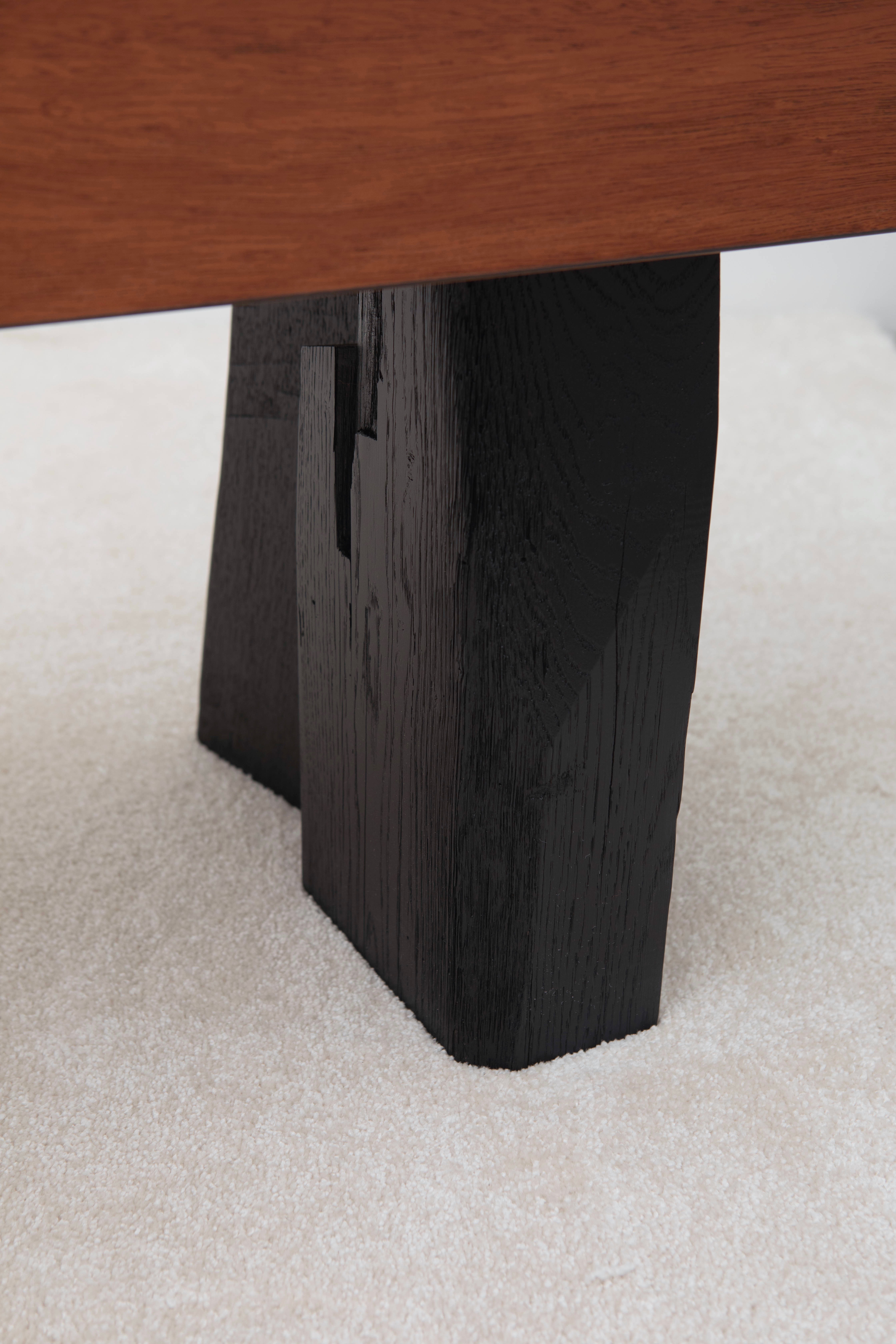 Acajou plaqué sur épicéa, arêtes poirier teinté noir, piètement en chêne brossé laqué noir